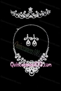 Intensive Flower Rhinestone Alloy Jewelry Set With Crown Necklace And Earrings