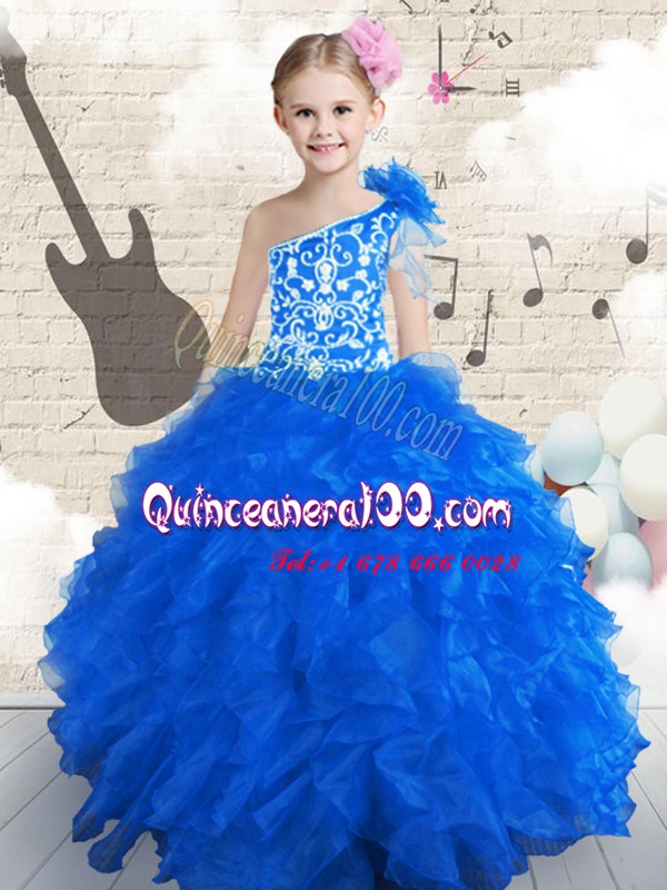 Gorgeous One Shoulder Sleeveless Embroidery and Ruffles and Hand Made Flower Lace Up Evening Gowns