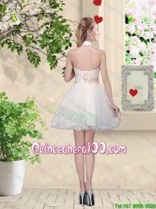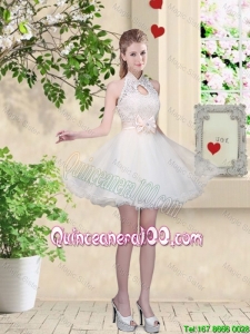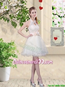 Great Feminine A Line Halter Top Dama Dresses with Bowknot and Lace
