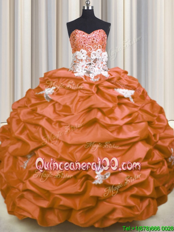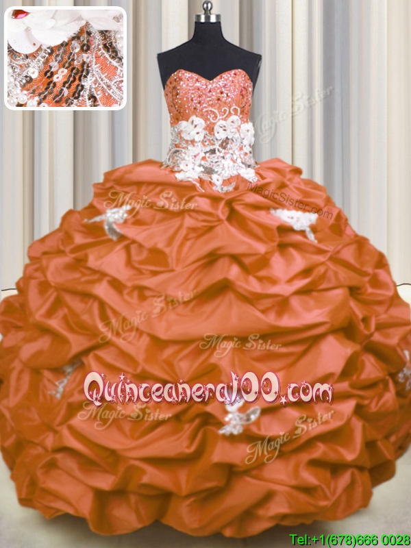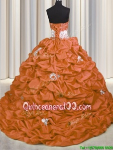Great Sleeveless With Train Appliques and Sequins and Pick Ups Lace Up Quinceanera Dresses with Orange Brush Train