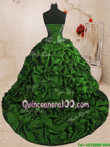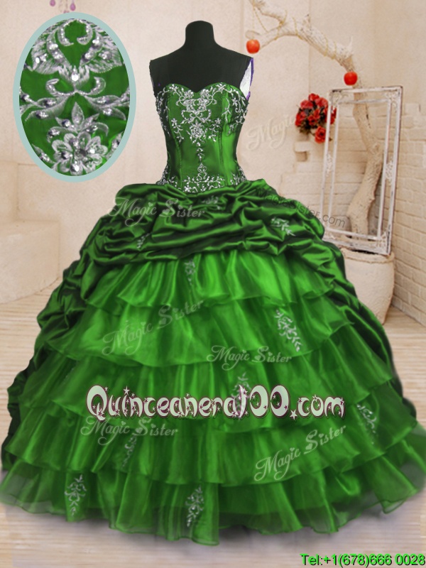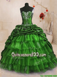 Great Sleeveless With Train Beading and Appliques and Ruffled Layers and Pick Ups Lace Up Quinceanera Dresses with Spring Green Sweep Train