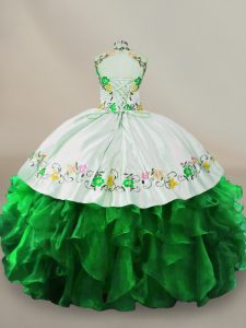 Green Organza Lace Up Halter Top Sleeveless Floor Length Quinceanera Gown Embroidery and Ruffles