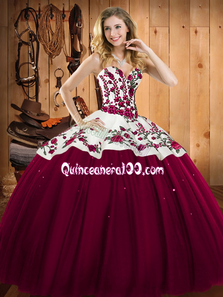 High Quality Burgundy Ball Gowns Embroidery Ball Gown Prom Dress Lace Up Satin and Tulle Sleeveless Floor Length