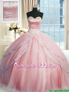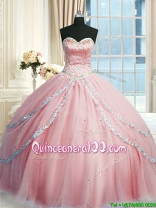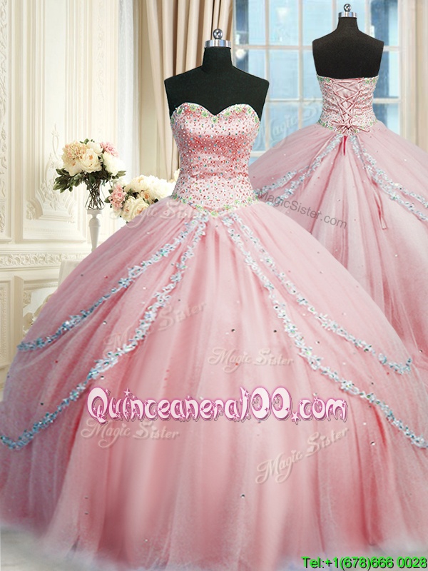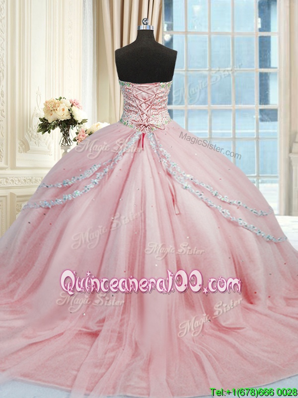 Latest Sleeveless With Train Beading and Appliques Lace Up Vestidos de Quinceanera with Pink Court Train