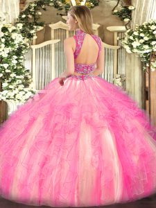 Lavender Two Pieces High-neck Sleeveless Tulle Floor Length Backless Beading and Ruffles Sweet 16 Dresses