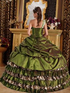 Leopard Print One Shoulder Ruffles Sweet 15 Dress in Olive GreenLeopard Print One Shoulder Ruffles Sweet 15 Dress in Olive Green