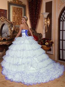 Lovely White Ruffled Layers Dresses for 15 with Blue AppliquesLovely White Ruffled Layers Dresses for 15 with Blue Appliques