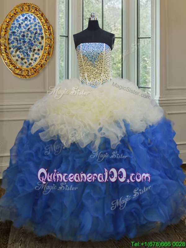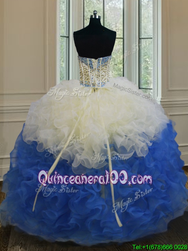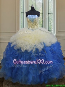 Low Price Blue And White Lace Up Quince Ball Gowns Beading and Ruffles Sleeveless Floor Length
