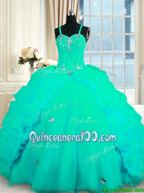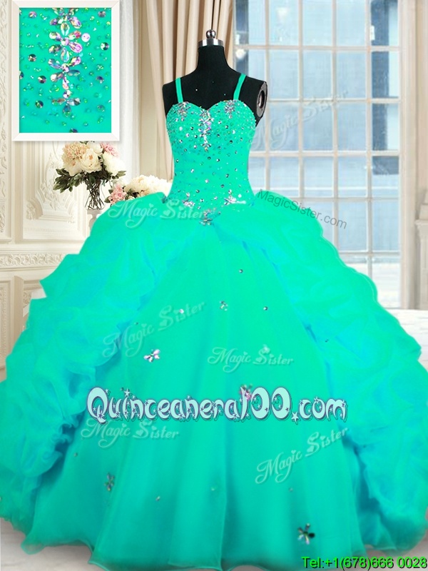 Most Popular Turquoise Sleeveless Organza Sweep Train Lace Up Quinceanera Dresses forMilitary Ball and Sweet 16 and Quinceanera