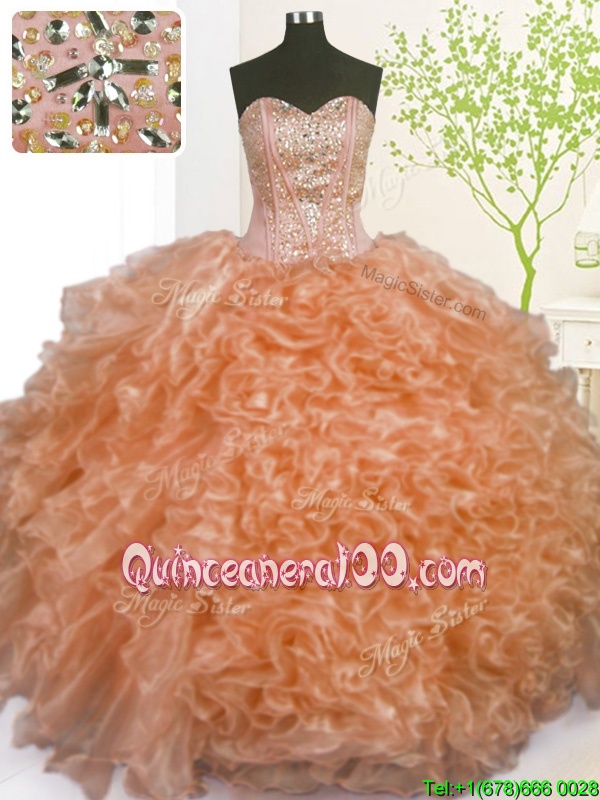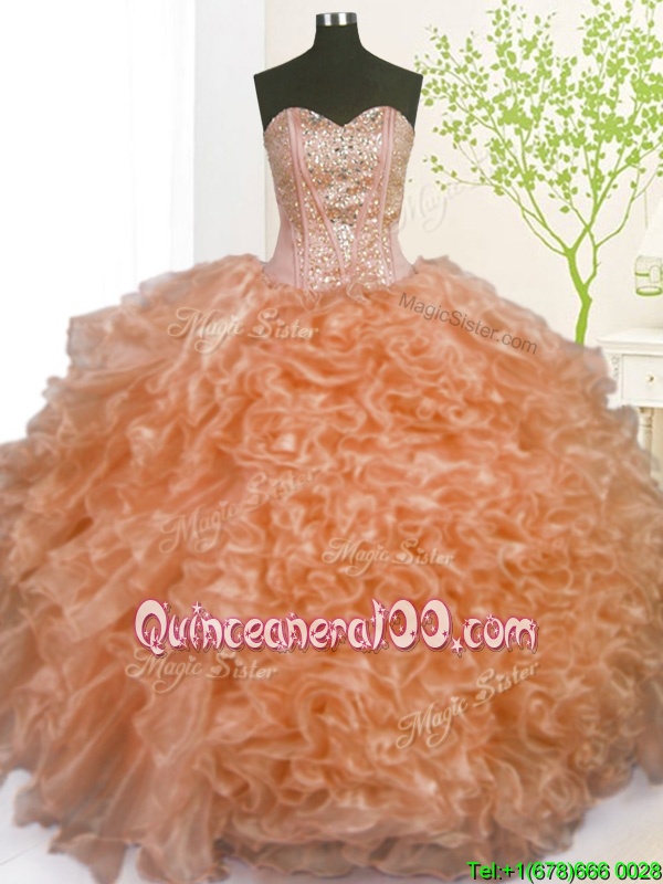 On Sale Organza Sweetheart Sleeveless Lace Up Beading and Ruffles and Pick Ups Quinceanera Dresses inPeach