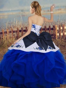 On Sale Sleeveless Floor Length Embroidery and Ruffles and Bowknot Lace Up Quinceanera Gowns with White And Purple