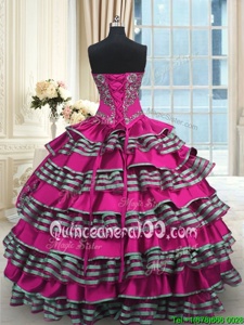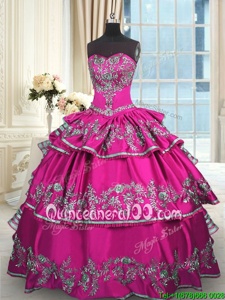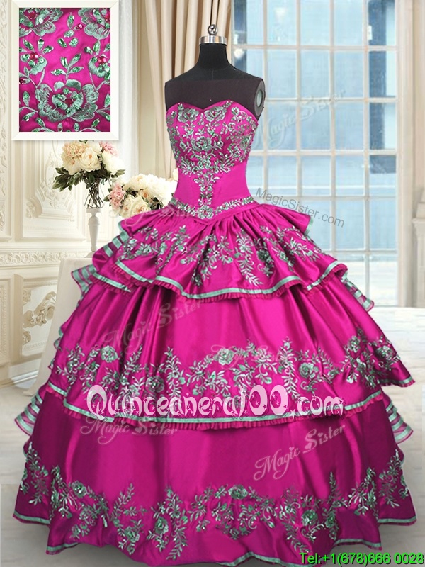 On Sale Sweetheart Sleeveless Ball Gown Prom Dress Floor Length Embroidery and Ruffled Layers Fuchsia Satin