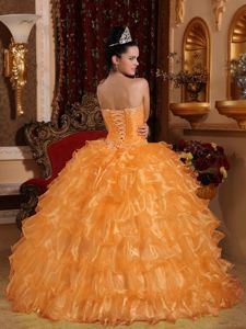 Orange Ruched Strapless Quinces Dresses with Ruffles and Beading