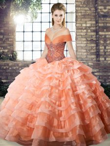 Peach Sleeveless Brush Train Beading and Ruffled Layers Quinceanera Gowns
