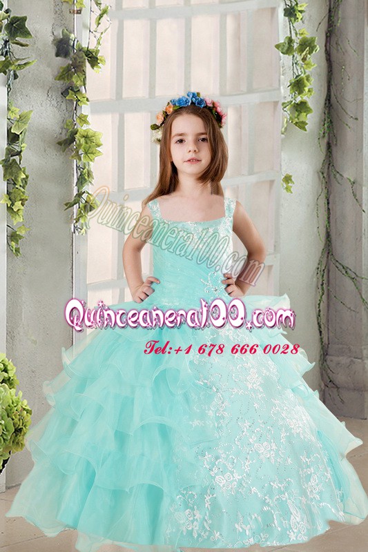 Perfect Light Blue Sleeveless Floor Length Lace and Ruffled Layers Lace Up Pageant Dresses