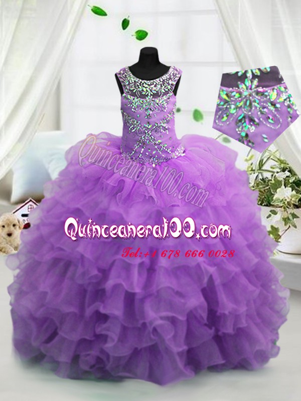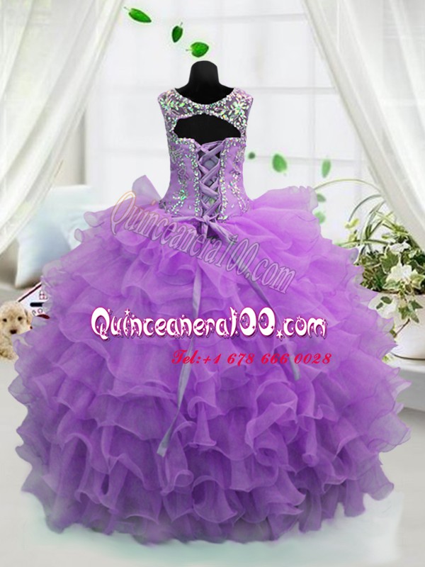 Perfect Scoop Lavender Ball Gowns Beading and Ruffled Layers Pageant Gowns Lace Up Organza Sleeveless Floor Length