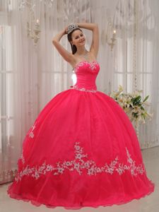 Popular Coral Red Strapless Ruched Sweet 15 Dresses with Appliques