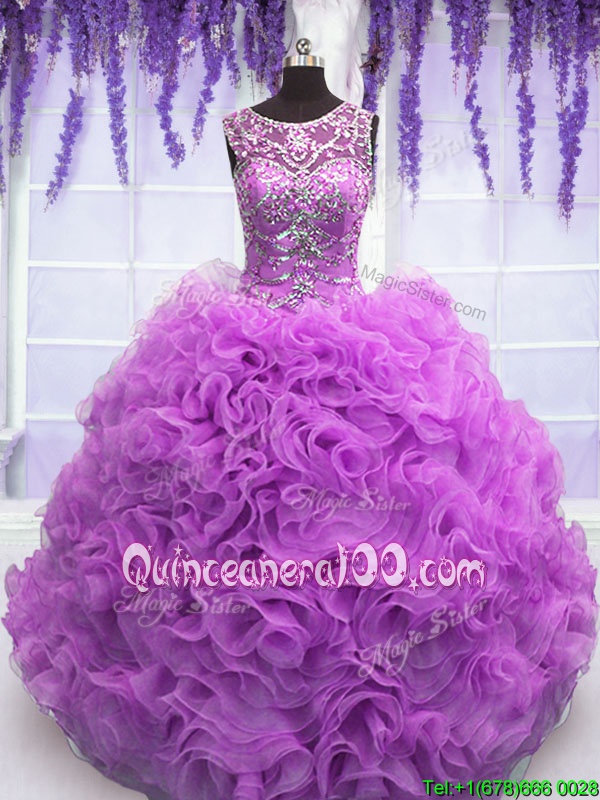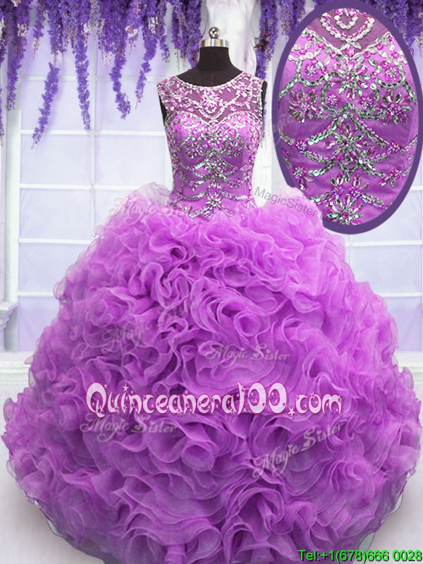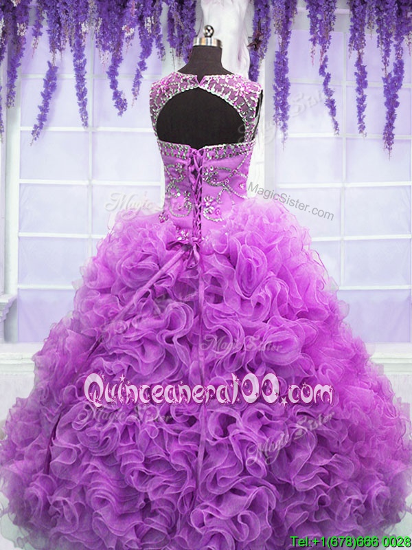 Popular Lilac Ball Gowns Scoop Sleeveless Organza Floor Length Lace Up Beading and Ruffles Sweet 16 Dresses
