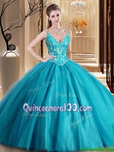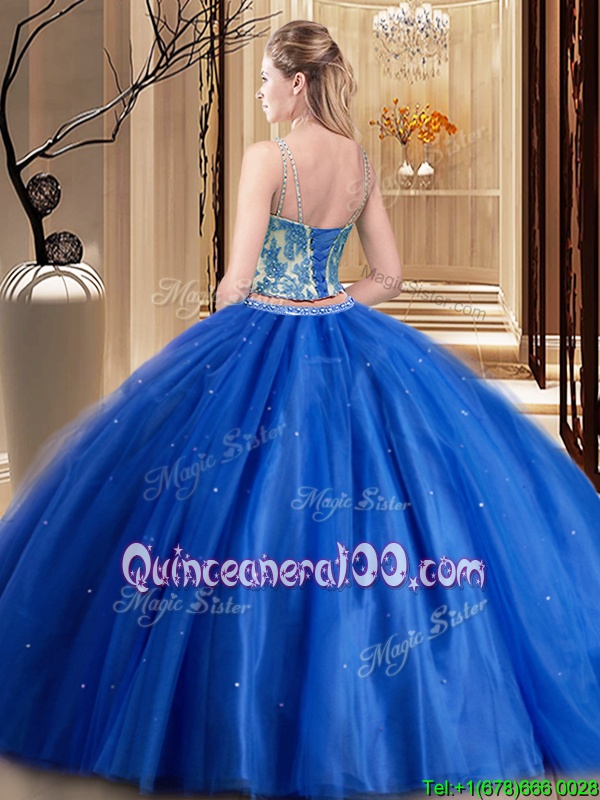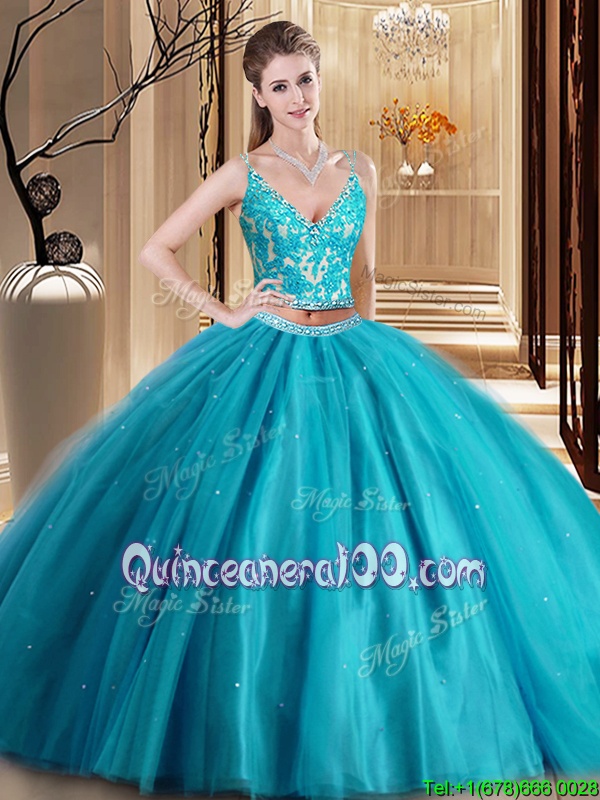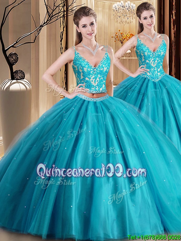 Popular Teal Two Pieces Tulle Spaghetti Straps Sleeveless Beading and Lace and Appliques Floor Length Lace Up Quinceanera Dress