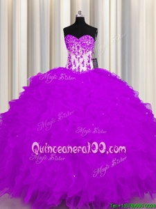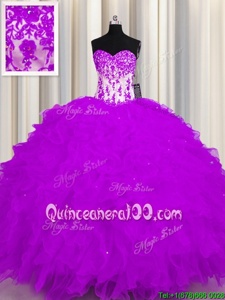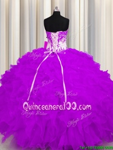 Purple Ball Gowns Organza Sweetheart Sleeveless Appliques and Ruffles Floor Length Lace Up Quinceanera Gowns