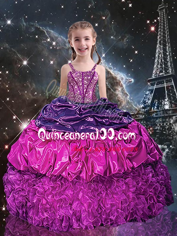 Purple Organza Lace Up Pageant Dress for Teens Sleeveless Floor Length Beading and Ruffles and Pick Ups