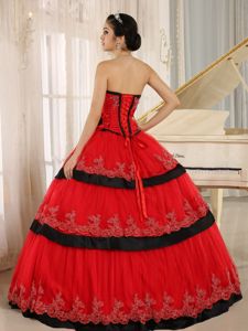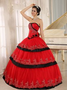 Red Lace Hem Decorated Dress for Quince with Hand Made Flowers