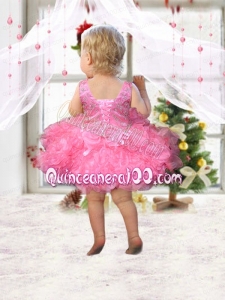 Rose Pink Scoop Beading and Ruffles Little Girl Dress with Lace-up