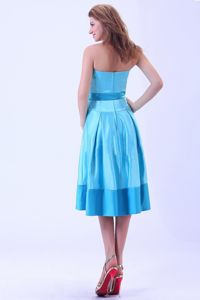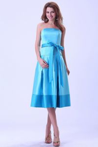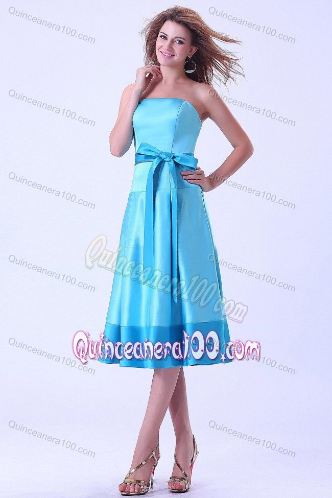 Satin Aqua Blue Dama Dress With a Bow Sash in Tea-lengthSatin Aqua Blue Dama Dress With a Bow Sash in Tea-length
