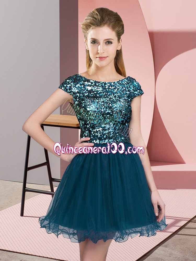 Scoop Cap Sleeves Zipper Quinceanera Court Dresses Teal Tulle