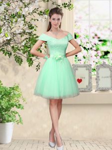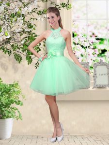 Sleeveless Knee Length Lace and Belt Lace Up Quinceanera Court Dresses with Apple Green