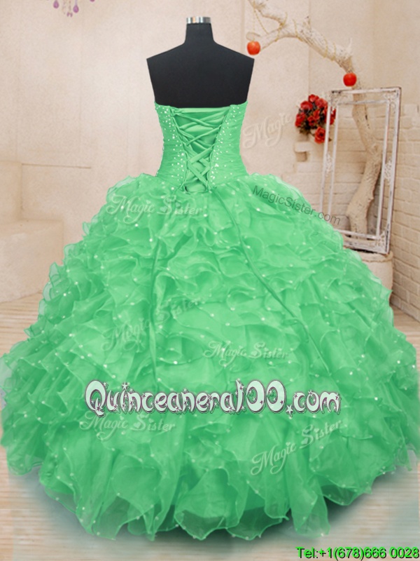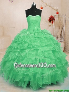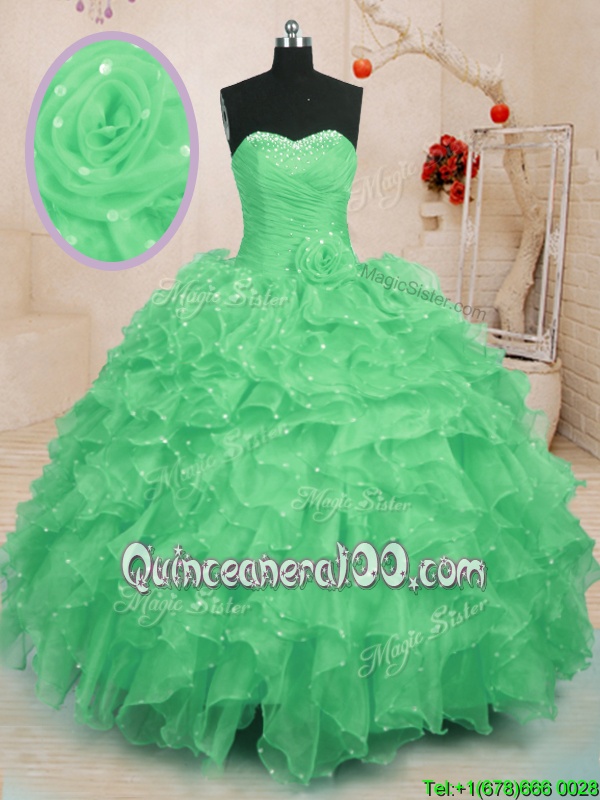 Sleeveless Organza Floor Length Lace Up Quince Ball Gowns inGreen forSpring and Summer and Fall and Winter withBeading and Ruffles and Hand Made Flower