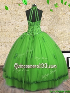 Spring Green Lace Up Halter Top Beading 15th Birthday Dress Tulle Sleeveless