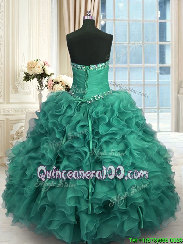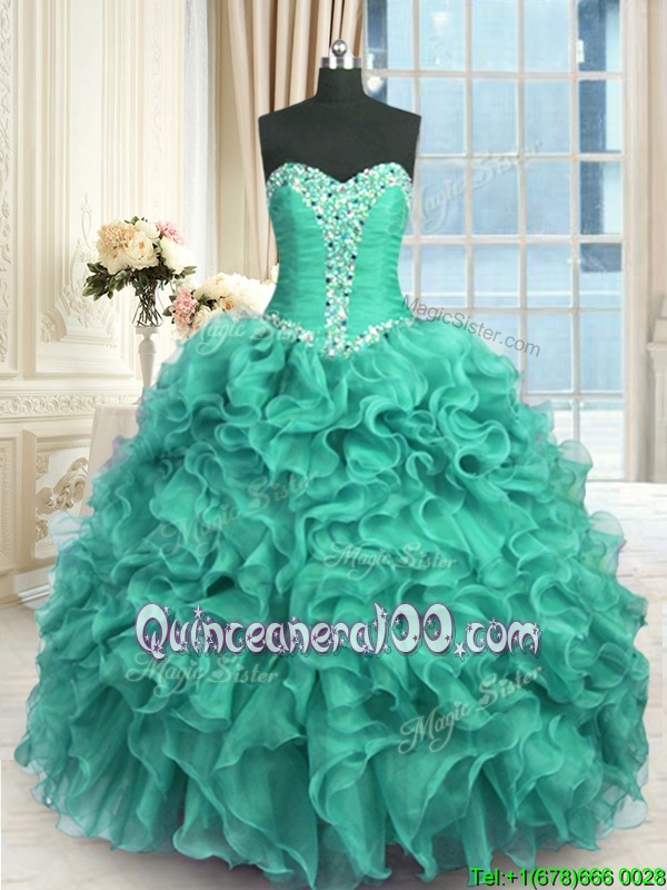 Stunning Turquoise Ball Gowns Sweetheart Sleeveless Organza Floor Length Lace Up Beading and Ruffles 15 Quinceanera Dress