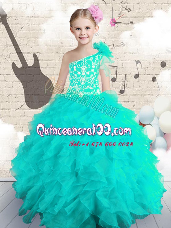 Stylish One Shoulder Sleeveless Floor Length Embroidery and Ruffles and Hand Made Flower Lace Up Little Girl Pageant Dress with Aqua Blue