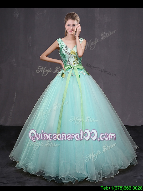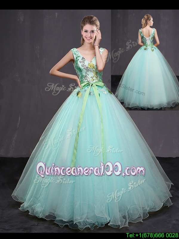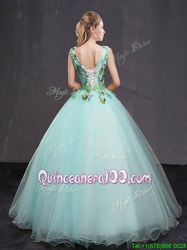 Super Aqua Blue Ball Gowns Tulle V-neck Sleeveless Appliques and Belt Floor Length Lace Up Quinceanera Gown