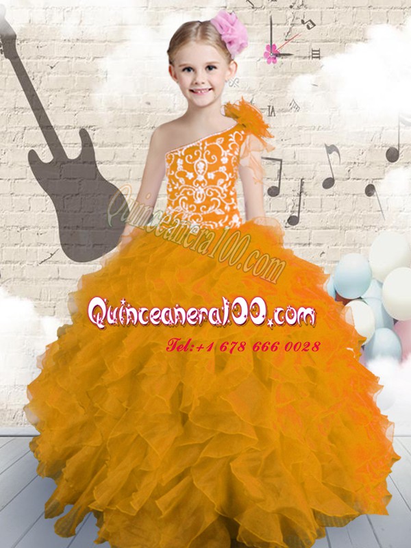 Super One Shoulder Organza Sleeveless Floor Length Little Girls Pageant Gowns and Embroidery and Ruffles and Hand Made Flower