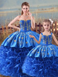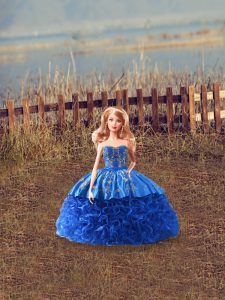 Super Sleeveless Embroidery and Ruffles Zipper Ball Gown Prom Dress with Royal Blue Brush Train
