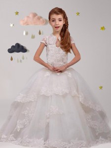 Superior Scoop Short Sleeves Brush Train Backless Flower Girl Dress White Tulle