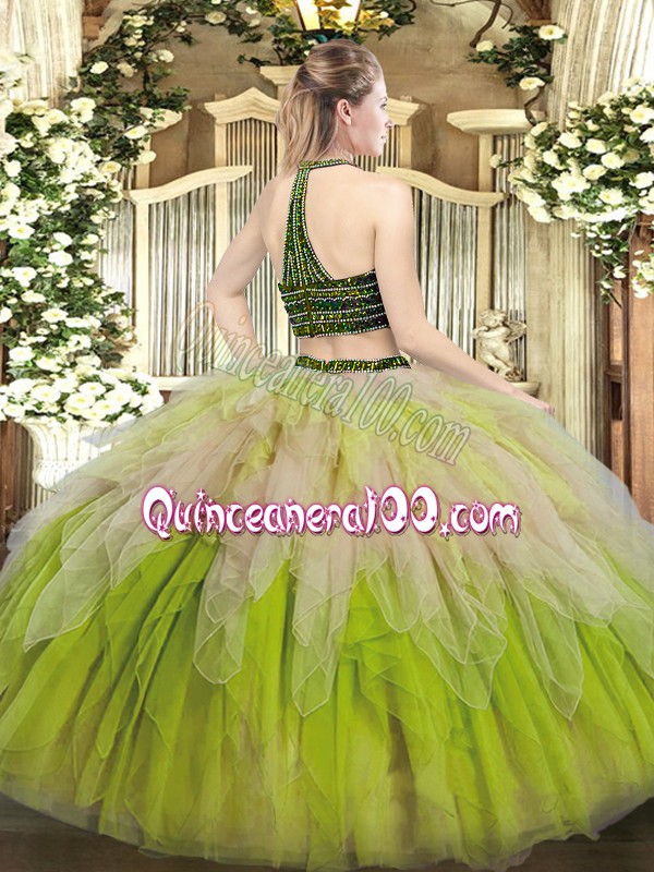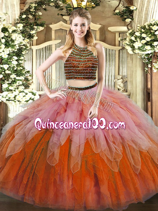 Sweet Multi-color Two Pieces Beading and Ruffles 15th Birthday Dress Lace Up Tulle Sleeveless Floor Length