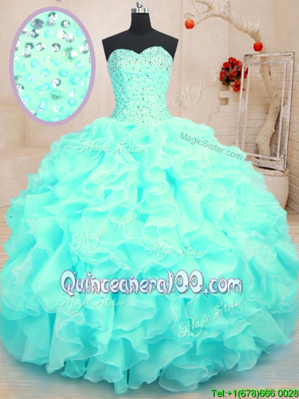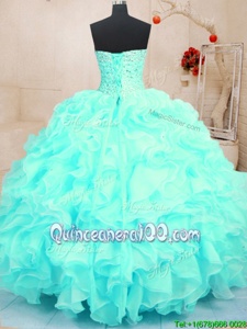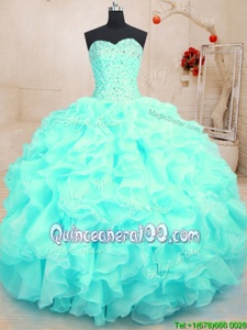 Sweetheart Sleeveless Quinceanera Gown Floor Length Beading and Ruffles Aqua Blue Organza