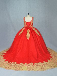 Traditional Red Tulle Lace Up Scoop Sleeveless Quinceanera Gowns Court Train Appliques