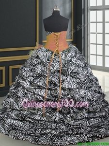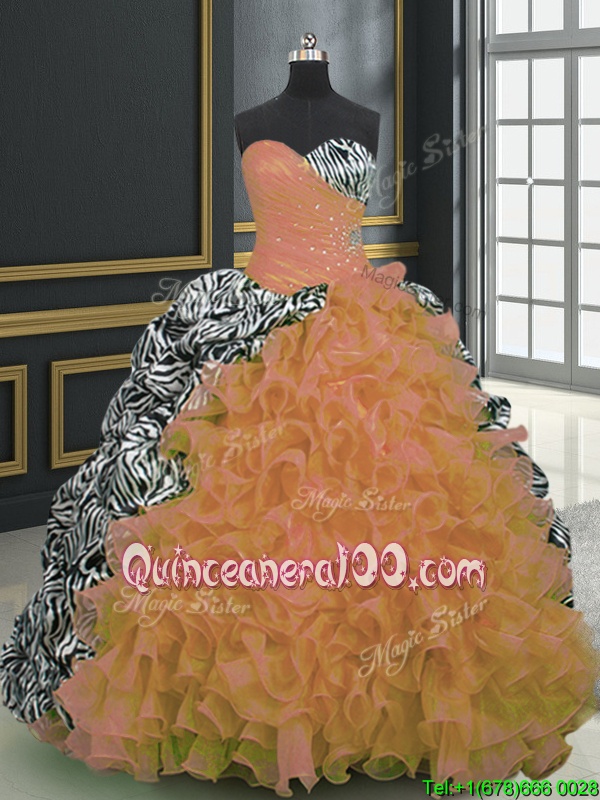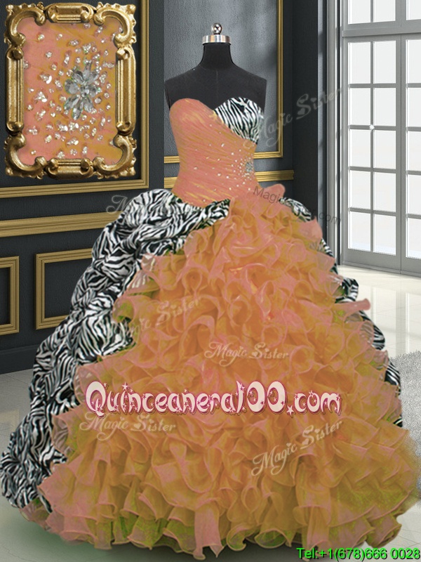 Traditional Spring and Summer and Fall and Winter Organza and Printed Sleeveless With Train Vestidos de Quinceanera Brush Train andBeading and Ruffles and Pattern