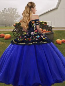 Trendy Floor Length Blue And Black Quinceanera Gowns Off The Shoulder Sleeveless Lace Up