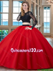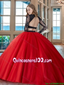 Two Piece Ball Gown Scoop Tulle Appliques Backless Long Sleeves Quinceanera Dresses in Red