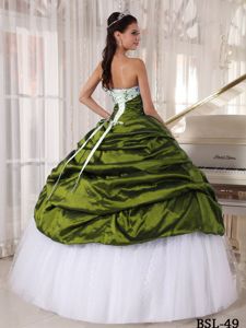White and Olive Green Ball Gown Quince Dress in Taffeta and Tulle