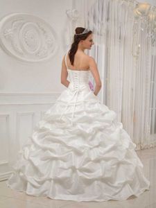 White One Shoulder Quinceanera Gown with Beading and Fuchsia FlowersWhite One Shoulder Quinceanera Gown with Beading and Fuchsia Flowers