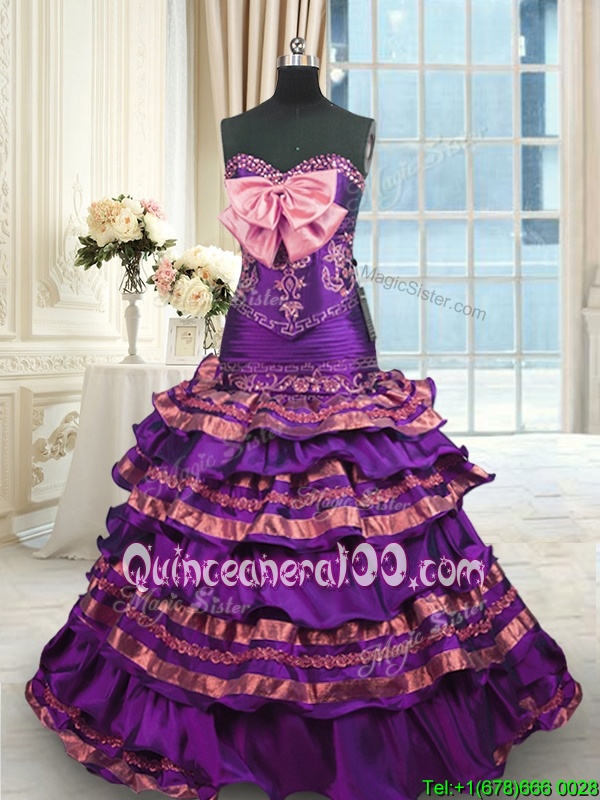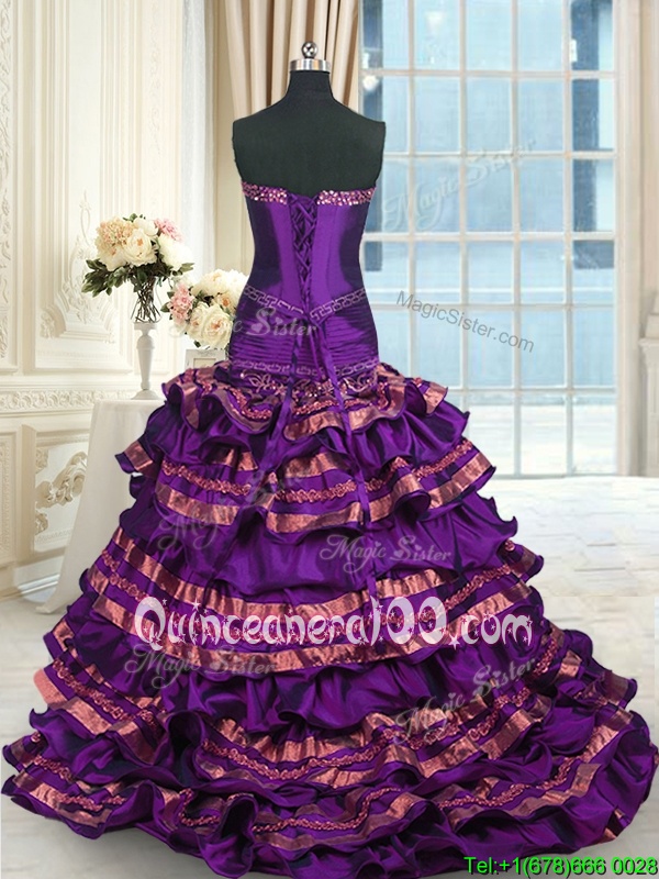 Wonderful Mermaid Purple Sweetheart Lace Up Appliques and Ruffled Layers and Bowknot Quince Ball Gowns Brush Train Sleeveless