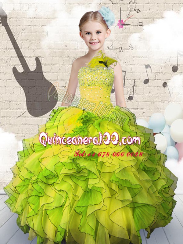 Yellow Green Lace Up Girls Pageant Dresses Beading and Ruffles Sleeveless Floor Length