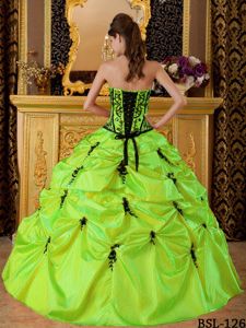 Yellow Green Taffeta Strapless Dress For Quinceaneras with Black EmbroideryYellow Green Taffeta Strapless Dress For Quinceaneras with Black Embroidery